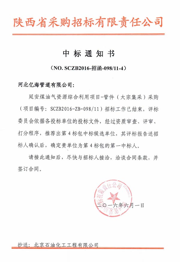 公司成功中標延長石油延安煤油氣綜合利用項目焊制管件標段